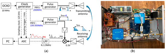 Developed impulse radar system: (a) Block diagram; (b) Inside of radar equipment.