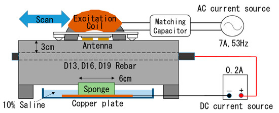 In the diagnosis of steel corrosion, electromagnetic nondestructive methods based on eddy current [5] or resistivity [6] are often used for directly accessible conditions. Since rebar in concrete cannot be easily accessed, there are many specialized inspection methods for accuracy, rapidity, destructiveness, contactness, resolution, or quantitativeness. The most accurate and quantitative method is the destructive method, in which a concrete core is extracted and directly inspected, but its rapidity and versatility are limited. There are also many semi- or non-destructive inspection techniques, which are well-summarized in [7]. Semi-destructive techniques, such as surface potential measurement [8,9,10,11] and the polarization resistance method [12,13,14], have been practically applied to the evaluation of the potential for corrosion and the corrosion rate, respectively. Moreover, the electrical impedance method [15,16,17] is effective and reproducible. However, most semi-destructive methods lack the rapidity, spatial resolution, and quantitativeness.