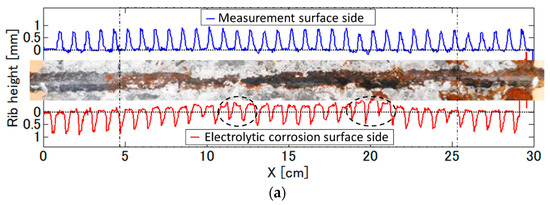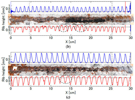 Figure 12 shows the cross-sectional photographs just after the destruction of the concrete. From the photographs, red and black rust are observed. Because oxygen penetrates more easily at the edges of concrete, the red and black rust adhere the to near edge and the interior of the specimen, respectively. The figures also show the rib height in two measurement lines toward the VDR measurement surface (upper side) and the electrolytic corrosion surface (bottom side). The circle with a broken line indicates the area having high corrosion loss. The rib height in the upper side does not change, but that in the lower side decreases from = 6 to 24 cm, which corresponds to the saline injection area. This indicates that the rebar has corroded so severely that its cross section is deformed. In addition, the local decreases in the rib height can be observed at = 12 and 20 cm for the D13 rebar, = 13 and 18 cm for the D16 rebar, and = 14 cm for the D19 rebar. The deformation from 0 to 10 cm in D16 is caused by not corrosion but a role mark on the rebar.