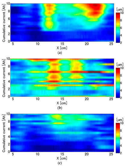 The vibration displacement spatially distributed over the whole rebar was evaluated. Figure 14 shows the results of the vibration displacement of the rebar from the VDR images. The results are also shown at cumulative currents of 5 Ah and 10 Ah. The vibration displacement at a cumulative current of 0 Ah is approximately 3 µm, and the variation in the scan direction is small, indicating that the scan measurement is highly reproducible. At a cumulative current of 5 Ah, the vibration displacement around = 12 cm increased by a factor of 3 to 9 µm, corresponding to the rust juice leakage observed at = 12 cm on the top surface of the specimen due to the surface crack extension from a cumulative current of 6 Ah. At a cumulative current of 10 Ah, the overall vibration displacement increased, with the maximum vibration displacement occurring near = 22 cm. Thus, a clear change in spatial distribution was also observed.