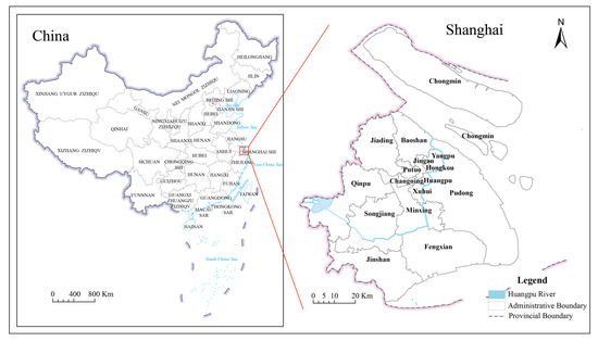 This paper takes Shanghai as the study case area. Shanghai is located between 120°52′~122°12′E longitude and 30°40′~31°53′N latitude and is a coastal city in a low-altitude area. It is also China’s international economic, financial, trade, shipping, and technology innovation center, and is ranked third in the world in the Global Financial Center Index (GFCI). As one of the seven mega-cities in China, Shanghai has a resident population of nearly 25 million people. With its high population density, building density, and resource intensity, the range of damage caused by natural disasters and the economic and population losses incurred are also larger. Potential natural disasters in Shanghai include typhoons, heavy rainfall and flooding, lightning strikes, ground subsidence, earthquakes, etc. [34]. As emergency evacuation sites established in response to major natural disasters and emergencies, urban emergency shelters can effectively protect people’s lives, reduce casualties, enhance the city’s evacuation and disaster relief capabilities, and provide assistance for post-disaster recovery. According to the information released by the Shanghai Municipal Bureau of Statistics, as of 2020, Shanghai has built a total of 91 emergency shelters available for use, including 2 Class I emergency shelters, 60 Class II emergency shelters, and 29 Class III emergency shelters. The regional overview in Shanghai is shown in Figure 2. The control of indicators of effective shelter area per capita and service radius of different levels of emergency shelters are shown in Table 1.