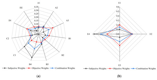 A single-level judgment matrix was constructed according to Table 1, and the subjective weights of each indicator were calculated by combination with the AHP method. The objective weights of each evaluation indicator were calculated by the CRITIC method. Finally, the relative affiliation matrix was established according to the type of indicator, and the deviation square sum optimal combination weighting model was established. By solving the model, the optimal weight coefficient matrix LT1 = [0.4398, 0.5602]T and LT2 = [0.4794, 0.5206]T for the subjective–objective combination assignment of the target layers T1 and T2. The subjective weight, objective weight, and combined weight of each evaluation indicator are shown in Figure 4.