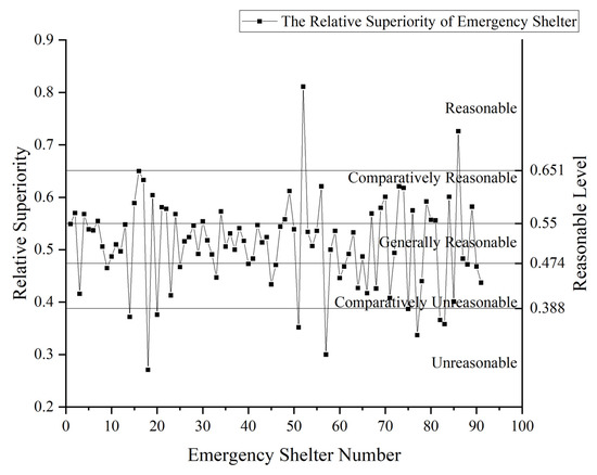 The relative superiority of a single emergency shelter is calculated and the evaluation scores are divided into five numerical intervals according to the natural interruption method, corresponding to five evaluation levels from low to high: unreasonable, comparatively unreasonable, generally reasonable, comparatively reasonable, and reasonable, and the evaluation results of the spatial distribution of each emergency shelter are obtained as shown in Figure 5.