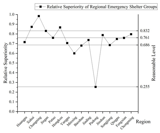 In the same way, the results of the spatial distribution evaluation under the effect of regional grouping of each emergency shelter are calculated as shown in Figure 6. From the scale of the regional grouping of emergency shelters, there is one region with unreasonable spatial distribution, which is Pudong New District, and its relative superiority value is much lower than other regions. Combined with Table 5, it can be seen that there is only one emergency shelter available in the region, and the number of emergency shelters is seriously insufficient and the service population gap is much larger than other regions, so it is urgent to plan new shelters to relieve the service pressure. There are three comparatively unreasonable regions, six generally reasonable regions, three comparatively reasonable regions, and three reasonable regions.