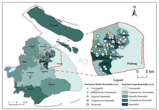 From the scale of individual emergency shelters, there are nine emergency shelters in Shanghai with unreasonable spatial distribution, which need to be banned or improved; nineteen shelters are comparatively unreasonable and need to be adjusted; thirty-five shelters are generally reasonable; twenty-six shelters are comparatively reasonable; and two shelters are reasonable.