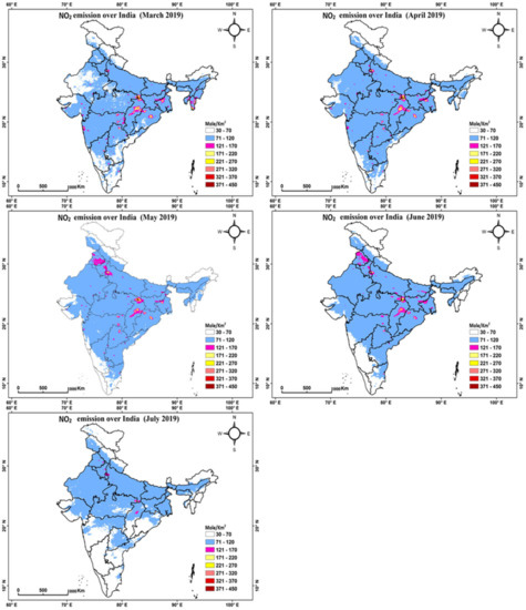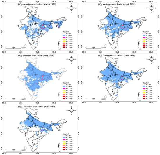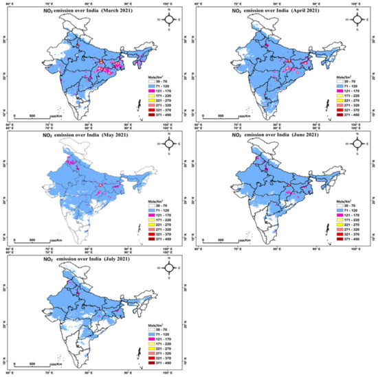 Figure 1 shows the concentration of NO2 emissions over India, obtained from the Sentinel-5P, from March to July 2019. It is observed that high values of NO2 emission clusters are recorded over the thermal power plant belts of Punjab, the National Capital Region (NCR) of Delhi, Western Uttar Pradesh, Chhattisgarh, Jharkhand, Orissa and West Bengal. An extremely high NO2 concentration of greater than 321 mole/km2 was observed over a few areas. Figure 2 depicts the concentrations of NO2 emissions over India from March to July 2020. After forced lockdown 1 on 24 March 2020 by the Indian government, more than half of the country experienced low NO2 concentrations (i.e., below 70 moles/km2) (see Figure 2). A reduced NO2 concentration was observed in the early stage of lockdown 1 itself, even in the high-concentration clusters in the thermal power plant belts and Northern India. This fall in the thermal power plant belt was attributed to a drop in power requirements because of the shutdown of all industrial activities due to lockdown 1. The same trend was observed in April and May 2020 during other lockdown periods. Only a few industries were permitted to operate during unlocking period 1, which started on 1 June 2020. We observed that the NO2 emissions over India remained low in June and July 2020, compared to that in June and July 2019. Figure 3 depicts the concentrations of NO2 emissions over India from March to July 2021. As the lockdown imposed in 2021 was not as strict as that of 2020 and industries were permitted to operate, it can be seen that the NO2 emissions in 2021 were of the same level as in 2019. The changes in NO2 concentration over eight cities of NW India, namely Amritsar, Jalandhar, Khanna, Patiala Delhi–Anand Vihar Terminal, Gurugram, Ghaziabad and Noida, during March–July of 2019 to 2021, are shown in Table 4. The NO2 concentrations were reduced significantly over these eight cities in the year 2020, with respect to 2019 and 2021. An approximately 18% reduction in average NO2 concentration was observed in 2020 with regard to concentrations in 2019, and around a 19% increase in the average NO2 concentration was observed in 2021 with respect to concentrations in 2020 during March–July. The maximum reduction of 28% in the average monthly NO2 concentration over all cities was observed in the month of April 2020 with respect to April 2019. Similarly, the maximum increase of 36% was observed in April 2021 with respect to April 2020.