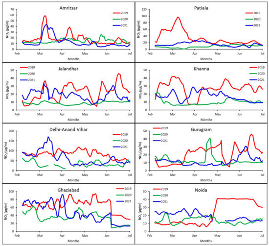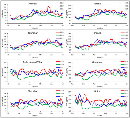 For our study, we utilized the in-site atmospheric NO2 data (obtained from the Central Control Room for Air Quality Management—All India) over North Indian cities, especially of Punjab state, from January 2019 to July 2021, covering the pre-COVID-19 period as well as all lockdown and unlocking periods during the first and second COVID-19 waves. NO2 is one of the major air pollutants in India and is highly dependent on local sources because of its short residential time in the atmosphere [44]. The in situ data were compared with remote sensing data from the Sentinel-5P/Tropospheric Monitoring Instrument (TROPOMI) acquired during the same period, to understand the utility of remote sensing data for places where actual in situ data are not available for the continuous monitoring of air pollutants.