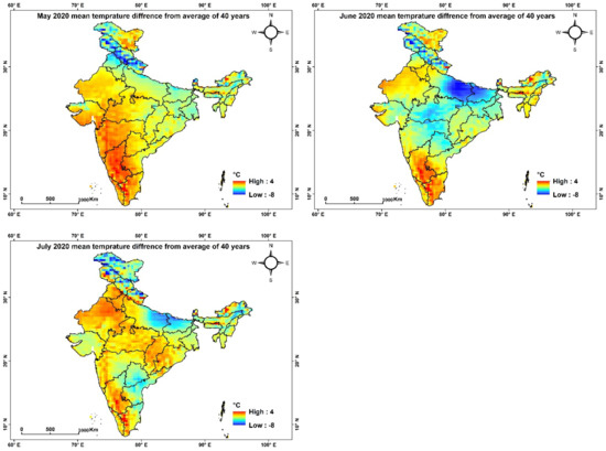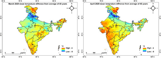 Further, during lockdowns 1–3, most of the industrial and commercial activities were suspended. Therefore, the combined effect of active western disturbances and the lockdowns may have significantly reduced the surface temperature. However, during June, the regularity of the western disturbance may have decreased—this was the time that the unlocking process had commenced, resulting in the re-starting of industrial activities. Both the reduction in the western disturbances and the re-opening of the industrial processes were probably responsible for the enhanced surface temperature. The same can be seen in Figure 6, indicating a shift towards and registering normal surface temperatures during June and July 2020.