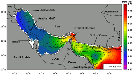 Figure 1. The mean dynamic topography (MDT) from 1993–2012 (shading, in meters) and general geostrophic circulation (black arrows, in m/sec) of the Arabian and Oman Gulfs were obtained from (MDT Global CNES-CLS18: Aviso+ (altimetry.fr); accessed on 30 April 2022), with the main geographic features (e.g., countries and rivers). Isobaths of 25, 50, 500, 1000, and 2000 m are shown as white contours obtained from the General Bathymetric Chart of the Oceans (GEBCO) (www.gebco.net; accessed on 15 April 2022).