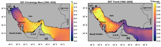Figure 2a shows the spatial distribution of SST climatology for our domain over the study period (1982–2020). The average SST climatology ranged from 23 to 28 °C across the study region. The lowest values (<24 °C) of SST climatology are observed in the northern part of AG off the Kuwaiti and Iraqi coasts, while the highest values (>28 °C) are found in the northern part of OG off the Omani coast. Figure 2b shows a map of the spatial SST trend map for the entire study area from 1982 to 2020. A statistically significant trend (p < 0.05) is detected across the whole AG and OG basins. The linear trend in the AG ranged from 0.4 to 0.65 °C/decade with an average of 0.44 °C/decade, while the SST trend in the OG was lower, varying from 0.15 to 0.45 °C/decade with an average of 0.32 °C/decade. The highest significant warming trend values (>0.6 °C/decade) are found in the northern part of AG off the Saudi and Iranian coasts. The lowest significant trend values (<0.3 °C/decade) are observed along the southern part of the Omani coast.