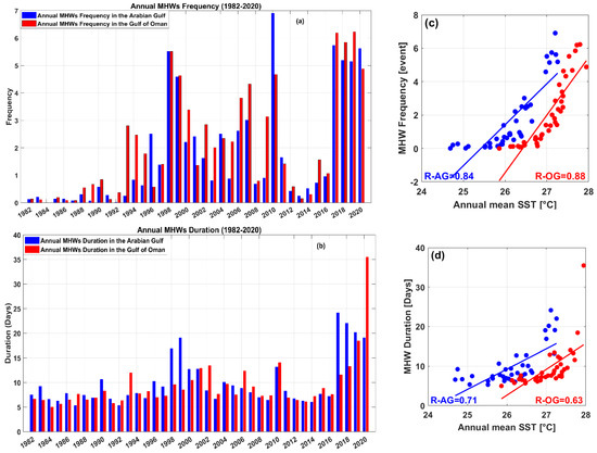 Figure 4. Regionally averaged annual means of the MHW (a) frequency (events/year), and (b) Duration (days/year). The blue and red bars represent the Arabian and Oman Gulfs (AG and OG), respectively. The right panels show the scatter plots of annual mean SST versus annual mean MHW (c) frequency, and (d) duration over the AG (blue) and OG (red) from 1982 to 2020, with the blue and red lines representing the best-fit linear curve.