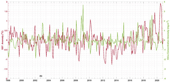 Figure 6. Time series anomalies of SST (red line) and Chl-a concentration (green line) for (a) the Arabian Gulf and (b) the Gulf of Oman between 1998 and 2020.