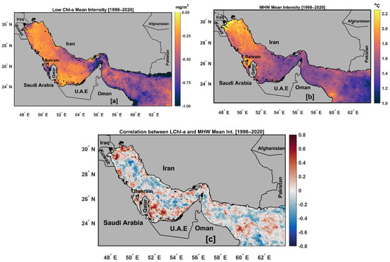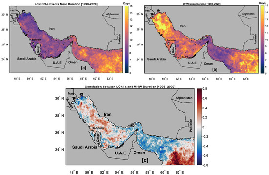 The compound between MHWs and LChl-a events is often defined when they occur simultaneously [11]. Figure 7 and Figure 8 show the spatial distribution of mean intensity and duration of MHW and LChl-a events and their correlation maps from 1998 to 2020. The LChl-a intensity ranges from −1 to 0 mg/m3, with the largest negative anomaly of Chl-a concentration (<−0.75 mg/m3) found in the coastal areas of OG, in the northernmost part of AG (Shatt-Al-Arab region), and off the southeastern coast of Bahrain. At the same time, these areas also have a high mean MHW intensity (>1.5 °C; Figure 7b) and the highest correlation (>0.6; Figure 7c). This coincidence between the highest negative Chl-a anomaly and intense MHWs in these three regions could be a good example of compound extreme events.