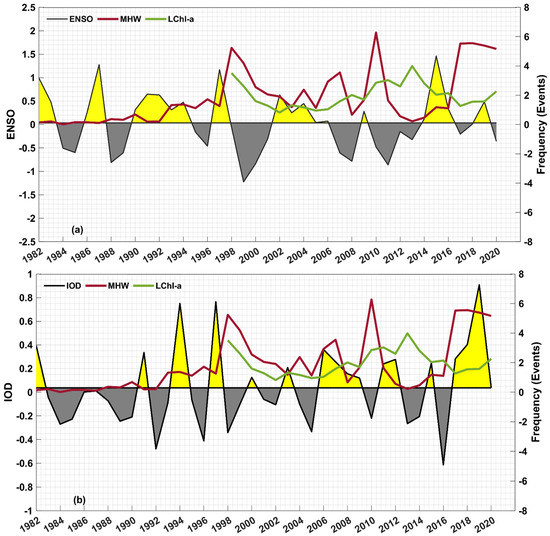 Figure 9. The annual time series of the normalized Niño 3.4 (ENSO) (shading, in (a)) and the Indian Ocean Dipole (IOD) (shading, in (b)), with the annual MHW frequency of (solid red line) from 1982 to 2020, and annual LChl-a frequency (solid green line) from 1998 to 2020 for the entire study area. The yellow and grey shading refer to the positive and negative phases of the climate indices, respectively.