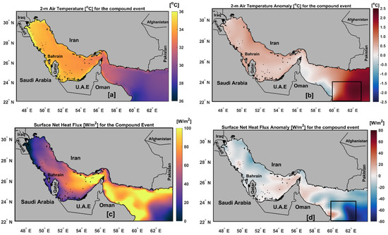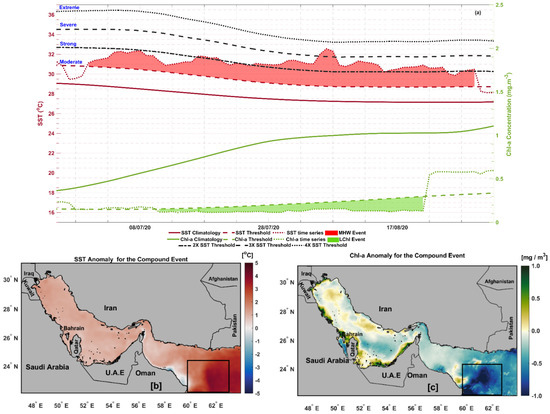 Figure 10b shows the spatial distribution of SSTA over the entire region during the compound event. Positive SSTA was observed throughout the region (AG and OG), except for the southeastern coast of Oman, where negative SSTA was observed. The highest SSTA was detected in the southern part of OG (bounded by the black box in Figure 10b), with values up to 5 °C above average. The spatial distribution of the Chl-a anomaly during the compound event is shown in Figure 10c. The lowest Chl-a concentration anomaly (~−1 mg/m3) was found in the same region with the highest SSTA. The highest positive Chl-a anomaly was observed along the coastal areas, especially within AG (i.e., along the coasts of Saudi Arabia, Bahrain, Qatar, and the United Arab Emirates). According to [44,47,48,49], these coastal areas in AG generally exhibit the highest sea surface productivity.