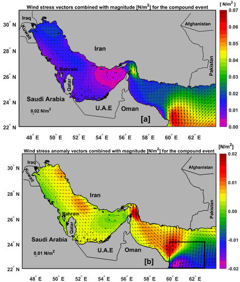 The dominant wind stress pattern during this event was summer southwesterly monsoon winds over the OG region, while weak northwesterly winds (Shamal) prevailed in AG (Figure 12a), which is consistent with [87,88]. The lowest negative wind stress anomaly (i.e., from −0.02 to 0 N/m2) is observed in the area affected by the compound event in OG (Figure 12b), which has the highest SST and the lowest Chl-a anomalies (Figure 10b,c). This reduction in wind stress is most likely associated with the formation of the MHW and the compound event. These results are consistent with previous studies [4,26,89,90] that found that MHW extreme events are associated with wind reduction.