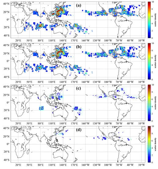 Figure 2 shows the density map of the distribution of all data pairs after collocation, which suggests that most of the captured tropical cyclone data from both HY-2 and SMAP are distributed in the Northwest Pacific in the northern hemisphere. This is consistent with the high frequency of tropical cyclone occurrence in the Northwest Pacific. In addition, most of the matchups are distributed in the Western Pacific Ocean and Eastern Pacific Ocean (along the coast of America). In the southern hemisphere, it is noted that no tropical cyclone has been observed in South America. In addition, there are some tropical cyclones captured by both HY-2 and SMAP in the open sea in the southern Indian Ocean. From Figure 2a,b, it can be seen that the number of matchups has a similar distribution, and compared to Figure 2c,d, this means that HY-2B captured the main tropical cyclones, and HY-2C/D accounted for a small part.
