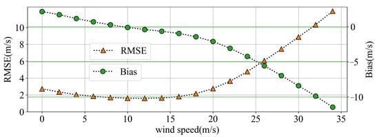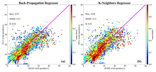 Due to extreme weather, it is extremely difficult to obtain wind speed during tropical cyclones, resulting in a scarcity of measured data. The National Oceanic and Atmospheric Administration (NOAA)/Hurricane Research Division’s SFMR has made great contributions to monitoring tropical cyclone wind speed by airborne remote sensing instruments for estimating the ocean surface brightness temperature at six frequencies between 4.6 and 7.2 GHz [42,43,44]. With the continuous optimization of the inversion model, the accuracy of its high wind speed measurement is also gradually improving, within ∼3.9 m/s in terms of RMSE [45]. In this paper, the independent SFMR high wind speed measurements are used as the true value to verify the performance and generalization ability of the machine learning models.