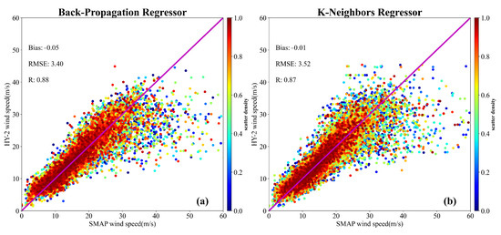 Figure 6 presents the comparisons of the revised winds by the six machine learning algorithms and SMAP. From the distribution of the scatter diagram, as shown in Figure 6f, the performance of the BR algorithm in retrieving wind speed is the worst, with a large RMSE of 3.60 m/s and a low correlation coefficient of 0.86. These six machine learning algorithms all exhibit the phenomenon of the scattered points not being concentrated in the high wind speed range. From the perspective of bias, the wind speed retrieved by the six machine learning algorithms is a slight underestimate. In terms of statistical metrics, the BP-NN algorithm achieves the best inversion accuracy with a small RMSE of 3.40 m/s, and high correlation coefficient of 0.88. Compared with the RMSE (4.27 m/s) of the original HY-2B/C/D product with respect to SMAP, the BP-NN algorithm leads to an overall improvement of 20.4%.