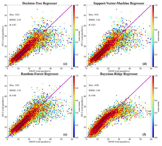 Scatterplots of the revised high wind speeds from HY-2B/C/D scatterometers by machine learning with respect to those from the SMAP radiometer. (a) BP-NN algorithm; (b) KNN algorithm; (c) DT algorithm; (d) SVM algorithm; (e) RF algorithm; and (f) BR algorithm.
