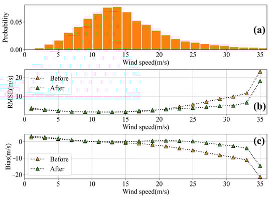 Comparisons before and after revision by the BP-NN algorithm. (a) Two-dimensional histogram of 30% test set in the range 0–35 m/s. (b) RMSE in wind speed before and after revision by the BP-NN algorithm compared to SMAP. (c) Bias in wind speed before and after revision by the BP-NN algorithm compared to SMAP.
