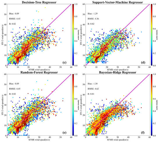 Scatterplots of the revised high wind speed measurements from HY-2B/C/D scatterometers by machine learning with respect to those from SFMR measurements. (a) BP-NN algorithm; (b) KNN algorithm; (c) DT algorithm; (d) SVM algorithm; (e) RF algorithm; and (f) BR algorithm.