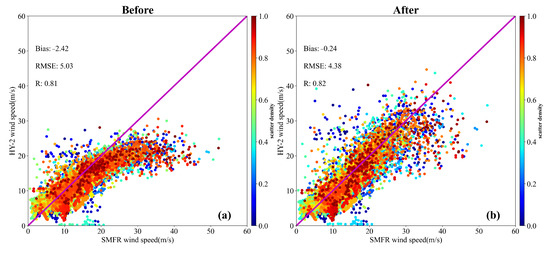 Heavy rainfall is often accompanied by tropical cyclones, which is likely one of the major drivers of algorithm performance [73,74]. The rain rate data are collocated from SFMR by the same procedure of wind collocation. As shown in Figure 11, it is found that the RMSE can be decreased from 5.03 m/s to 4.38 m/s, the bias can be decreased from −2.42 m/s to −0.24 m/s, and the correlation coefficient can also be improved slightly under rainy conditions. The comparison shows that the BP-NN method can also give stable wind speed accuracy under such conditions.