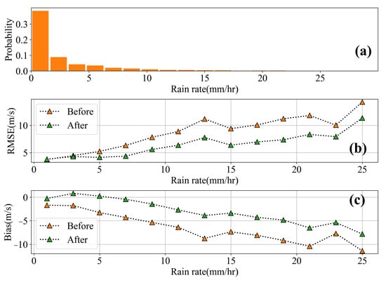 Figure 12a illustrates the histogram distribution of rain rate from 1 to 30 mm/h. Since the HY-2 scatterometer data are all subject to quality control, the rainfall rate of the data matched with the SFMR data is around 1 mm/h; however, the amount of strong rainfall data is not sufficient. From Figure 12b,c, it can be seen that the performance of the revised winds is better than that of the HY-2 scatterometer wind speed measurements, which shows the effectiveness of our model.