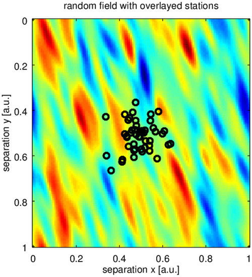 We present a simple numerical example illustrating described modelling. A set of virtual receiving stations (black circles in Figure 2) samples a random field that is drifting past. An example of received signals is depicted in Figure 3. Some mutual relations between each other can be observed. In Figure 4a cross-correlations for each pair of signals for zero time lag have been plotted as a function of the separation vector. To assess matrix Q we took least square fit of the function to estimated correlations near . Resulting ellipsis has been plotted at the same figure. Clearly, the correlation captures well basic spatial properties of the sampled field.