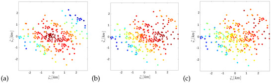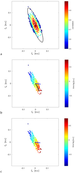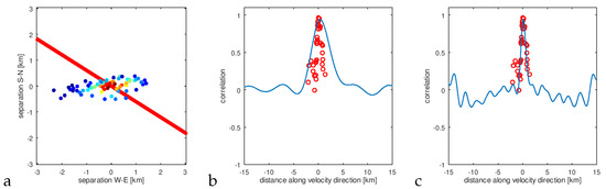 Figure 4b,c show time lag for maximum cross-correlation as a function of separation (it is clearly linear as formula (9) predicts). Now, combining the information on structure geometry with time delay gradient, we were able to estimate drift velocity (red strip in Figure 4c). The true drift velocity (black on Figure 4b) is very close to the estimated (red on Figure 4c). For comparison, we also give an isotropic estimate represented as the blue strip (the estimate of drift velocity obtained using the assumption of isotropy of random field—the quadratic form matrix is a scalar multiple of identity matrix in this case).