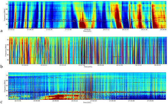 Amplitude dynamic spectra: (a)—L547449 set; (b)—L547785 set; (c)—L552177 set.