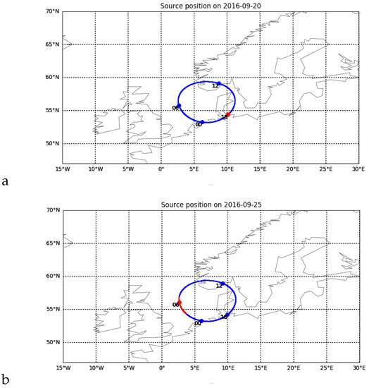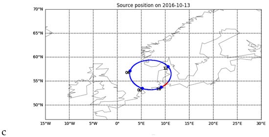 Although the estimates of the ionospheric drift velocity follow the convection pattern assessed by SuperDARN system for mid-latitude ionosphere may seem exaggerated for sets L547785 and L552177. To illustrate, that such values are still possible we present the drift estimations made by the ionosphere soundings at Pruhonice (49°59′N 14°32′E), Juliusruh (54°37′N 13°22′E) and Fairford (51°41′N 1°46′W) during the storm of 13.10.2016 which are respectively: 976 +/− 130 m/s (at 16:49 UT), 405 +/− 18 m/s (at 17:15 UT), 833 +/−146 m/s (at 17:53 UT) (https://giro.uml.edu/driftbase/ (accessed on 13 July 2022)). This illustrates possible ionospheric variability in space and time during disturbed conditions at mid-latitudes.