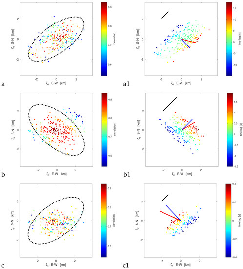 Correlations for zero time lag as a function of separation vector for datasets: (a)—547449, (b)—L547785, (c)—L552177, with quadratic form ellipsis overlaid; time lag for maximum of cross-correlation as a function of separation vector for datasets: (a1)—547449, (b1)—L547785, (c1)—L552177, with velocity estimates: red - taking into account anisotropy of structures; blue - isotropic. Black vectors indicate velocities with magnitude: 100 m/s, 1000 m/s, 1000 m/s for sets 547449, L547785, and L552177, respectively.