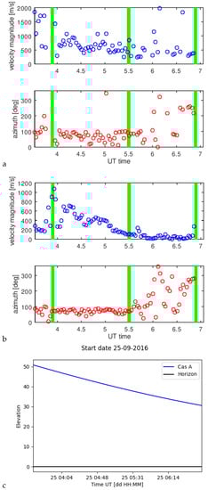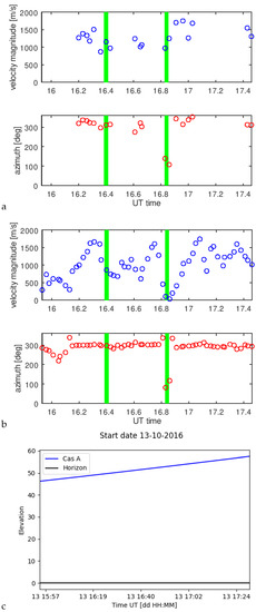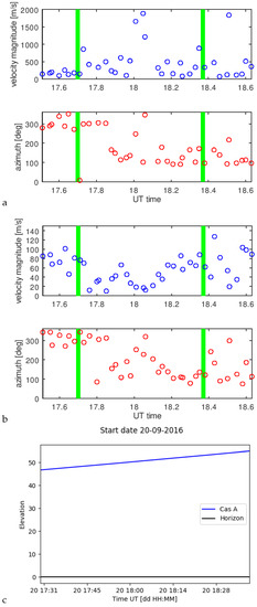 This allows calculating Q’ and the velocity . The Figure 10, Figure 11 and Figure 12 show the results for both estimators and the source elevations for considered periods. In green, we marked the periods where we made the comparison with SuperDARN radar convection pattern assessments. We limited the plots to values less than 2000 m/s.