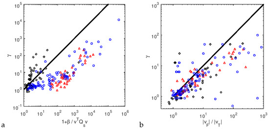 Collective plot for all considered datasets (blue circles—L547449, red triangles—L547785, black diamonds—L552177): (a)—experimental scaling factor vs the theoretical derived from Briggs model, (b)—experimental scaling factor vs. ratio of estimators magnitude .