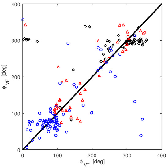 At this point we used the estimate (20) of the drift velocity that - in the Briggs model - should be consistent with (24). Figure 11a shows experimental velocity scaling factor vs. (20) given by Briggs model. The different markers refer to different data sets: black diamonds—L552177; blue circles—L547785; red triangles—L547449. One can see a quite large discrepancy between the theoretical scaling and experimental one, moreover, the markers representing different data sets are distributed nonuniformly. For a comparison Figure 11a gives experimental velocity scaling factor vs. the ratio of velocity estimators magnitude . In the latter case, one can see that the velocity modulus quotient is much closer to the experimental scaling factor than the theoretical value, and the points corresponding to the different data sets are evenly distributed. In Figure 12 the relation between azimuths of and is shown. They roughly agree, however a minority has large deviations, which may suggest that the relation between estimates is not scalar. The points grouping suggests that estimates have mainly zonal component, which is in agreement with the SuperDARN observations (Figure 14, Figure 15, Figure 16 and Figure 17).