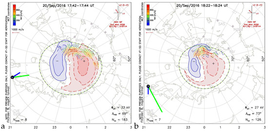 Qualitative caption. comparison of drift estimation by two methods, according to formula (12)—green—and formula (20)—blue—with ionospheric convection obtained by the SuperDARN system for moments: marked in Figure 10a,b with green vertical lines, for the quiet time (set L547449); panel (a) for 17:42 UT, and panel (b) for 18:22 UT of 2016.09.20.