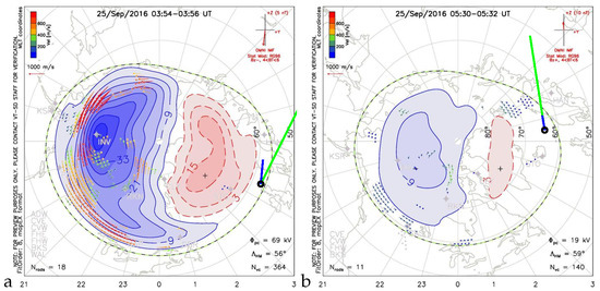 Qualitative caption. comparison of drift estimation by two methods, according to formula (12)—green—and formula (20)—blue—with ionospheric convection obtained by the SuperDARN system for moments: marked in Figure 19a,b with green vertical lines, for the quiet time (set L552177); panel (a) for 16:24 UT, and panel (b) for 16:48 UT of 2016.10.13.