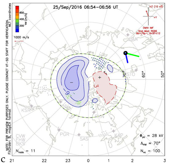 Qualitative caption. comparison of drift estimation by two methods, according to formula (12)—green, and formula (20)—blue, with ionospheric convection obtained by the SuperDARN system for moments: marked in Figure 18a,b with green vertical lines, for the quiet time (set L547785); panel (a) for 3:54 UT, panel (b) for 5:30 UT, and panel (c) for 6:54 UT of 2016.09.25.
