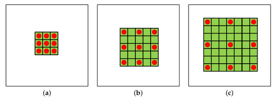 Receptive field of a dilated convolution. (a) 1-dilated convolution (conventional convolution) with kernel size has a receptive field. (b) 2-dilated convolution with kernel size has a receptive field. (c) 3-dilated convolution with kernel size has a receptive field.