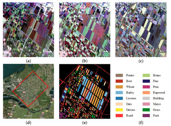 The Flevoland dataset. (a–c) The pseudo Pauli images of P-, L-, and C-band, respectively. (d) The geographic location of the dataset (marked with a red frame), which is centered at . (e) The ground truth. (f) The colormap of the 16 categories.