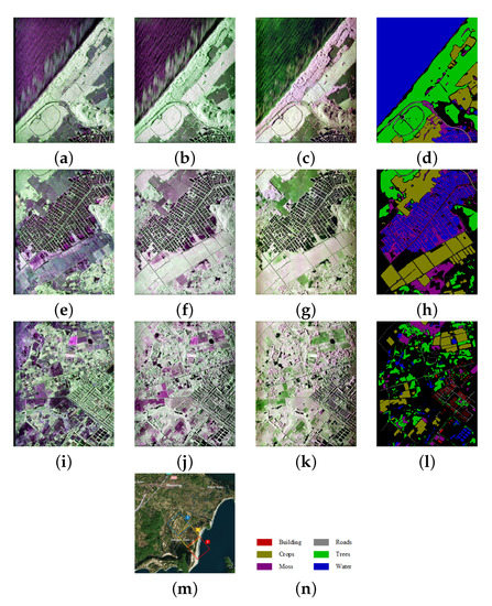 The Hainan dataset, including three images. (a,e,i) The pseudo Pauli images of L-band. (b,f,j) The pseudo Pauli images of C-band. (c,g,k) The pseudo Pauli images of the Ka-band. (d,h,l) The ground truth images. (m) The geographic location of the three images of the dataset (marked with three frames). The researching area is centered at . (n) The colormap of the six categories.