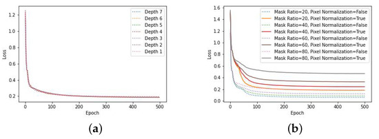 The curves of the pre-training loss are shown in Figure 7. Figure 7a shows the loss curves for the case of different encoder depths (the number of transformer blocks in the encoder) with a fixed masking rate of 80% and no pixel regularization, which indicates that the depth of the encoder has little effect on the pre-training procedure. Figure 7b shows the loss curves for the case of different mask ratios and different approaches of pixel normalization, with a fixed encoder depth of 4. It can be seen that at mask ratio below 80%, the loss curve shows an unexpected inflection point at the end of the warm-up stage but does not affect the convergence of the final pre-training results. In addition, the loss at the end of the pre-training stage is smaller at lower mask ratios. Although the classification performance of the model does not depend on the loss in pre-training, the shape of the loss curve shows that the pre-training results are steadily convergent. A convergent pre-training result is the basis for discussing the subsequent classification performance.