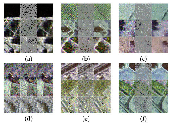 The reconstructed images of the pre-training models, with no pixel normalization. The left, middle, and right columns are the original image, the masked image, and the reconstructed image, respectively. (a) Mask ratio = 80, Depth = 1. (b) Mask ratio = 80, Depth = 4. (c) Mask ratio = 80, Depth = 7. (d) Mask ratio = 20, Depth = 4. (e) Mask ratio = 40, Depth = 4. (f) Mask ratio = 60, Depth = 4.