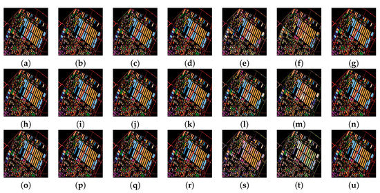 The classification image of the Flevoland dataset. The first to third rows are the classification results of P-, L-, and C-band, respectively. The different columns are the results of different methods. (a,h,o) CNN [19]. (b,i,p) CV-CNN [20]. (c,j,q) 3D-CNN [21]. (d,k,r) SViT [43]. (e,l,s) WMM [7]. (f,m,t) SVM [14]. (g,n,u) The proposed method.