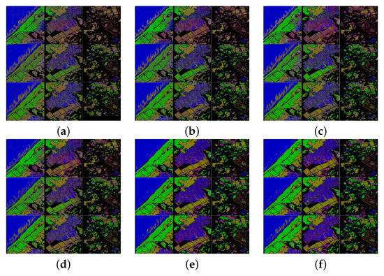 In the Flevoland dataset, 1% of the total labeled samples were randomly selected as training samples, which is 223 training samples for each class. The evaluation metrics include classification accuracy for each category, the overall accuracy, and the kappa coefficient. The experiments were carried out on the P-, L-, and C-band separately. Due to the small training sample size, the experiments were repeated 50 times to avoid randomness. The comparisons of results are shown in Table 2, Table 3 and Table 4, and the classification images are shown in Figure 9.