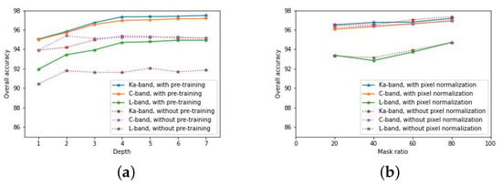 The results of ablation experiments. (a) The overall accuracy at different model depths and whether pre-training is used, with a fixed mask ratio and no pixel normalization. (b) The overall accuracy at different mask ratios and different approaches of pixel normalization, with a fixed model depth 4.