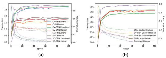 The curves of training loss and overall accuracy. (a) The curves of the four compared methods on the C-band of the Flevoland dataset and Hainan Dataset. (b) The curves of the four modified compared methods and the proposed method on the C-band of Hainan Dataset.