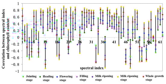 Figure 2 shows the changes of 62 spectral indices and correlation coefficient of leaf SPAD value in jointing, heading, flowering, filling, milk maturity, maturity and whole growth stage of winter wheat. Each vertical line in the figure corresponds to a spectral index. The seven points on the vertical line represent six single growth periods and whole growth periods. The length of the vertical line is the maximum and minimum difference between spectral index and correlation coefficient of chlorophyll concentration in six single growth periods and whole growth periods. The association between each spectral index and SPAD value is more or less affected by different growth periods, as seen in the figure. The association between spectral index V11 and chlorophyll concentration at heading stage is −0.11594, but the association between spectral index V11 and leaf SPAD value at maturity stage is as high as −0.919, which fluctuates greatly. We found that the vertical line length corresponding to each spectral index ranges from 0.1 to 1.1. The sensitive spectral indices selected by comprehensive consideration can reflect the differences of different growth periods, and it is applicable to all growth periods. It is based on the spectral indices corresponding to the maximum value of positive correlation coefficient and the minimum value of negative correlation coefficient between each growth period and SPAD value, to screen the sensitive spectral indices.