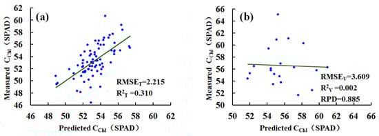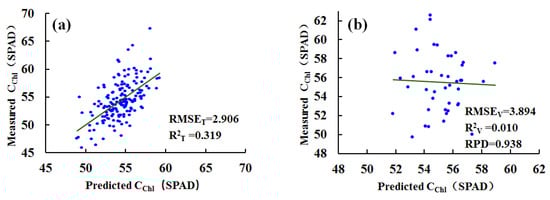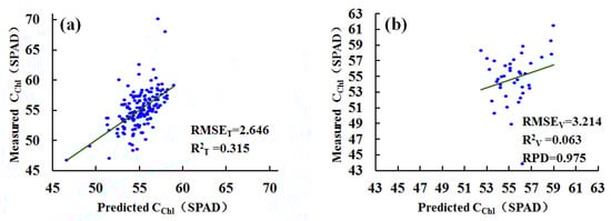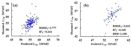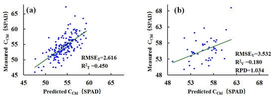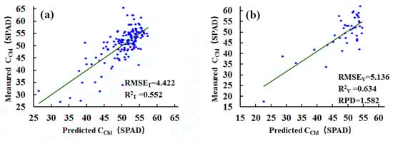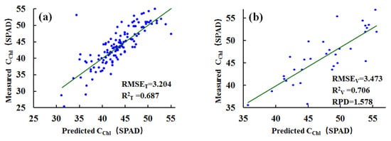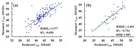 The estimated results of SPAD value for (a) training set and (b) validation set at heading stage.